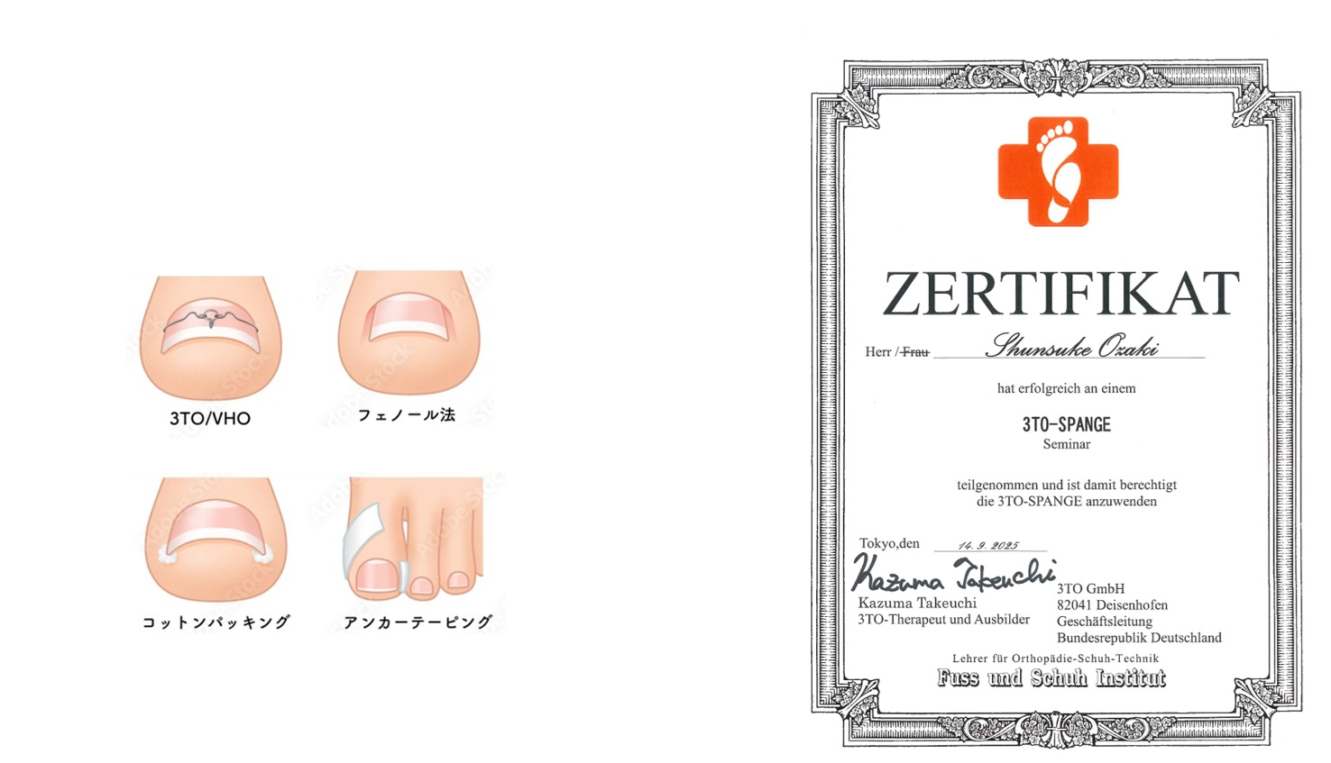 さまざまな巻き爪矯正治療がありますが、いずれも自費診療であり、その値段や矯正力はまちまちです。これまで当院では巻き爪爪矯正は他のクリニックや巻き爪センターにお願いしておりました。今回、3TO(VHO)式巻き爪矯正治療の資格を取得し、当院でも治療を開始しました。(他の巻き爪治療は資格不要なものが多いですが、3TOは資格の必要な医療行為となります。)3TOの特徴としては、他の矯正治療に比べても矯正力が優れており、爪が深く切り込んでいても施術可能で、施術当日から入浴、運動も可能であり、日常生活に支障がない優れた方法と言えます。