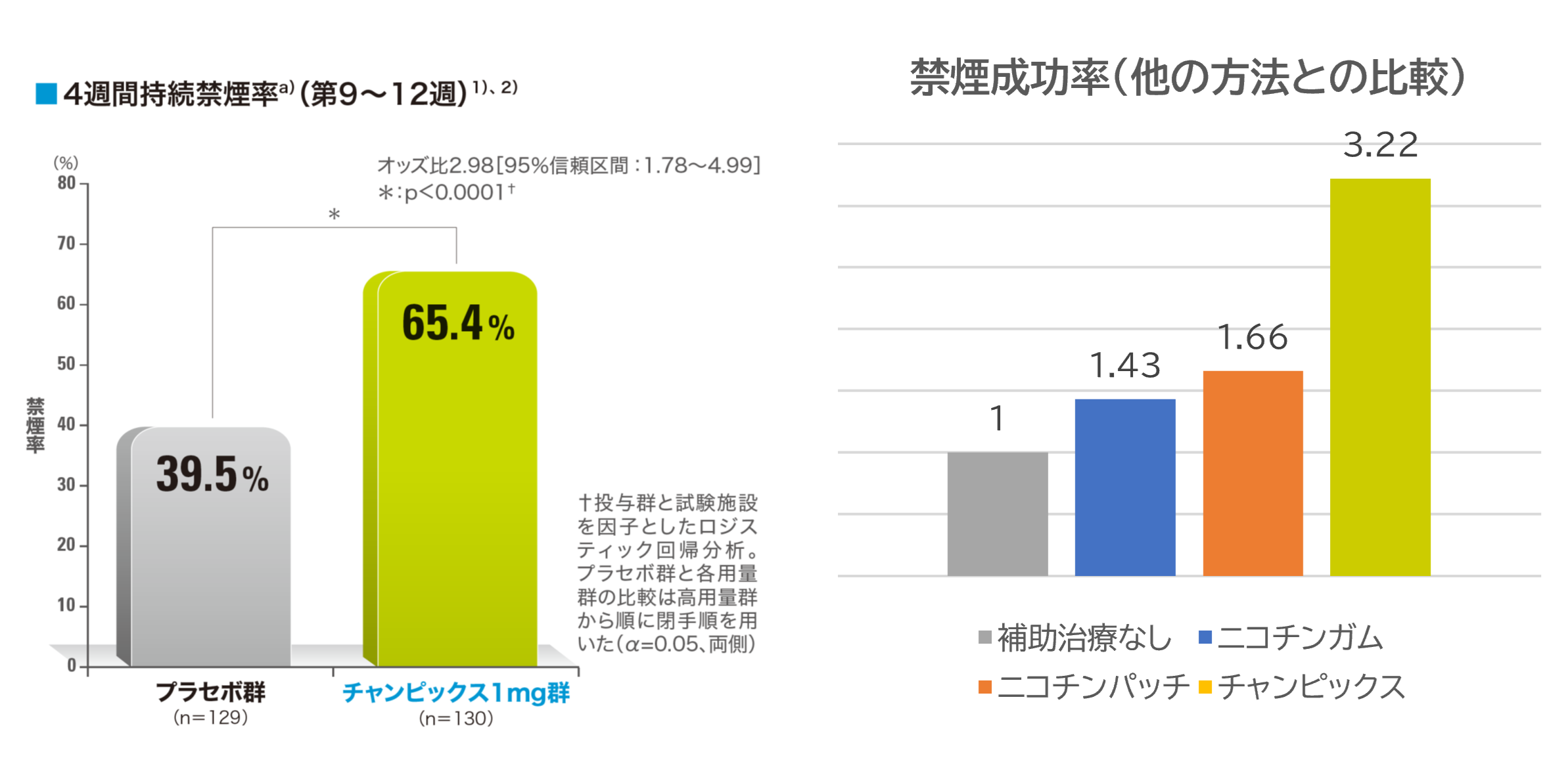 ・他の方法(ニコチンパッチやニコチンガム)と比較するとチャンピックスを使用した方が禁煙成功率は有意に高くなります。