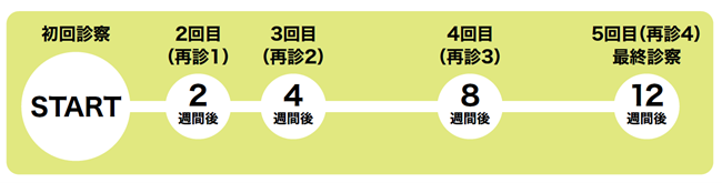 通院期間は3ヶ月(12週)です。初回診療で問診、採血、喫煙状況の確認、保険適応かどうかの確認を行い、条件を満たせば禁煙宣言書に署名して頂き禁煙治療を開始します。合計5回の診療で通院は終了となります。